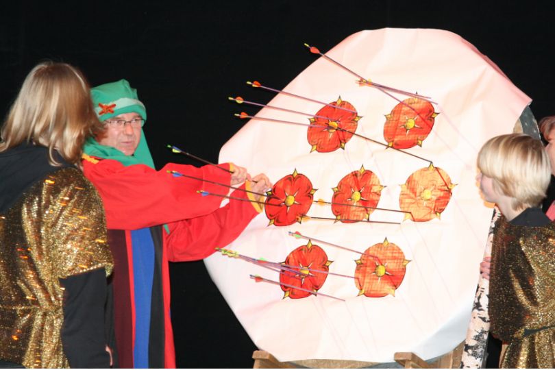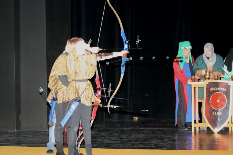 So veranstalteten die Dedinghäuser Bogenschützen, die in historischen Gewändern auf das 825jährige Stadtjubiläum einstimmten, ein „Bogenschießen mit Graf Bernhard“. Die Kindergruppe des Vereins zeigte die Aufführung „Ein Hut, ein Stock, ein Regenschirm“.